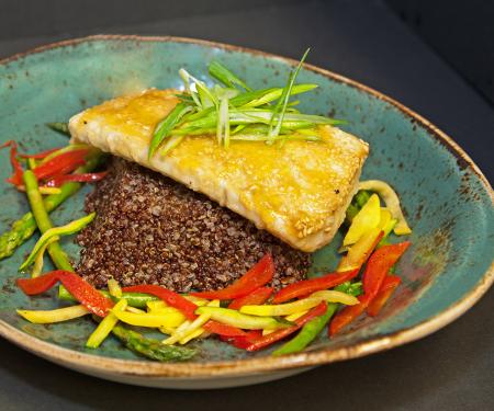 Cook up your vegetables to accompany our fish. Don’t forget the butter, salt and pepper folks. Place your quinoa down in a little mound in the center of the plate. Arrange your vegetables around the quinoa, then place our beautifully golden toasted Mahi on top. Adding another tablespoon of glaze won’t hurt. Top with some thin sliced scallions, grab your Mow Master and enjoy.