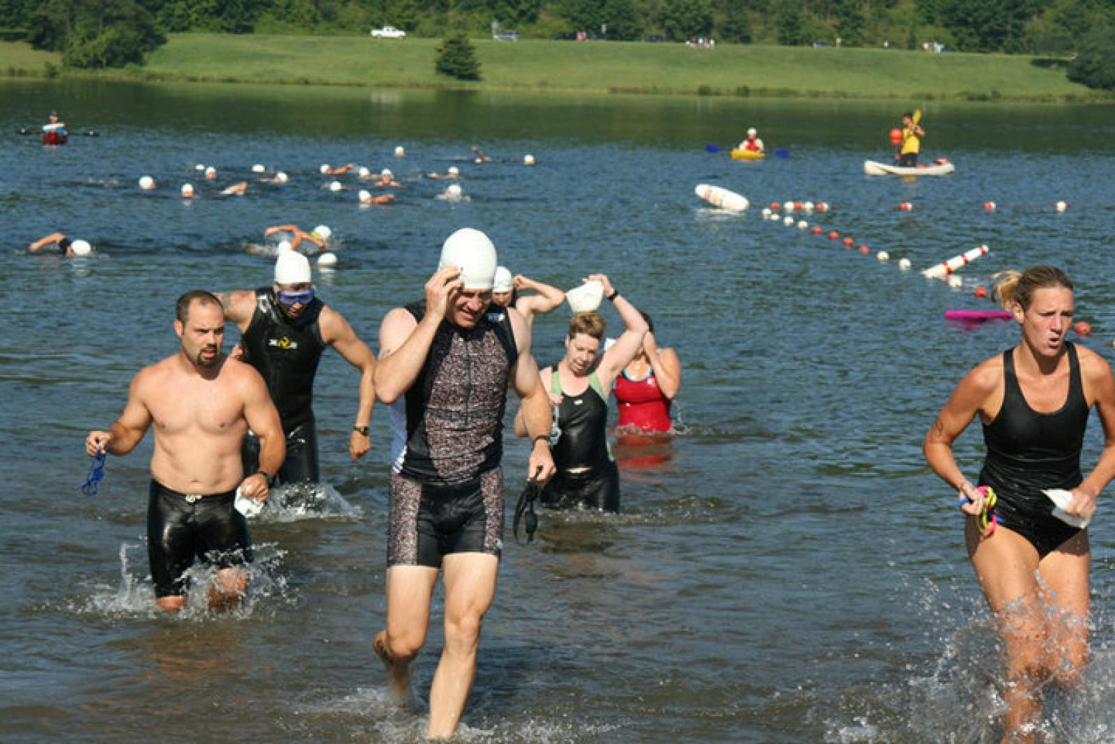 A 300-yard swim at Quaker Lake in Allegany State Park is the start of the Willow Creek Triathlon that raises money for the Disabled American Veterans in Warren and McKean counties. Photo courtesy ANF Visitors Bureau