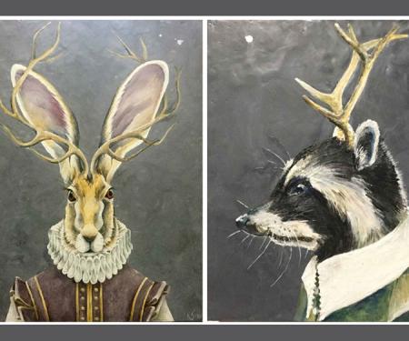 KARI: I always work from photos. (I've got too much going on in my head to focus on an image in there.)  I find a pic of a particular animal that speaks to me and go from there. I work on wooden panel boards, drawing the image in an outline (with the Whimsical Woodland series I work from 3 different images, one of the animal, one of the costume and another of the antlers). I then paint the background around the image and melt it with a heat gun, this smooths it out and creates an atmospheric quality to it. Next I begin painting the image from the top down, completing a section at a time, almost as though I break the piece down into many individual little paintings.  If working in smaller pieces, I may work on a couple at a time. My studio is the size of a postage stamp so the larger pieces are quite challenging, I generally end up painting parts of them upside down …
