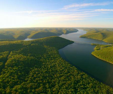 As your travel on Route 59, you will see the Kinzua Wolf Run Marina on your right, just before crossing the Allegheny Reservoir on the Morrison Bridge. Immediately past the bridge, stop for the view from Kinzua Point; here you have an amazing vista of the forest reflected onto the waters of the Allegheny Reservoir. Now drive back a few feet and turn left onto Longhouse Drive. The access road to Jakes Rocks is about a mile up Longhouse Drive; this impressive rock outcrop offers another developed overlook of the waters of the Allegheny Reservoir.